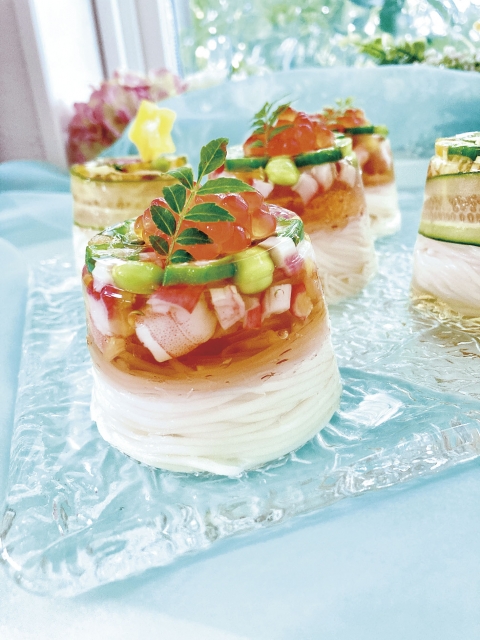フルーツ以外の肉や魚、季節の野菜などもゼリー寄せになります。色々な材料を固めて見た目も味も一緒に楽しむというのはワクワクしますし、食事の時間がとても豊かに感じられます。