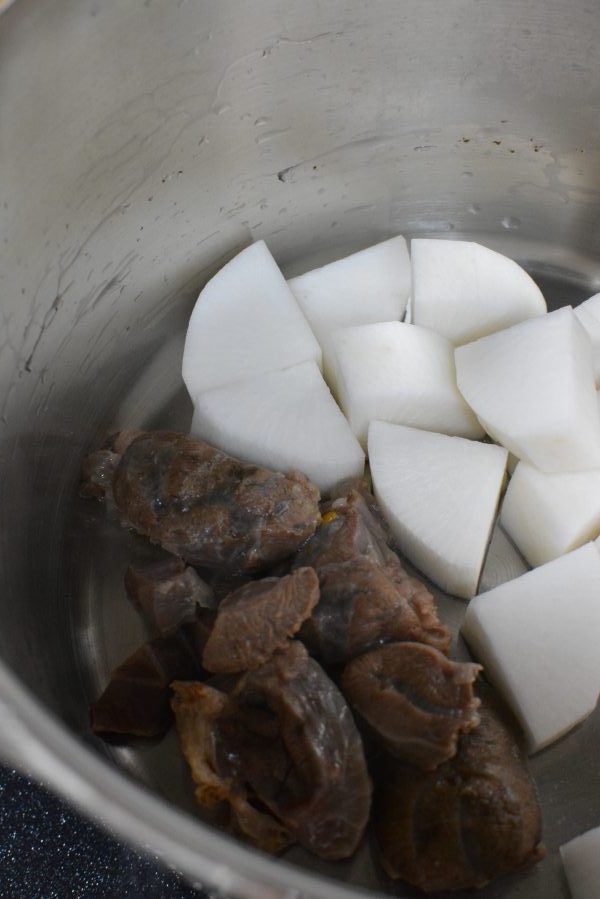 食べやすい大きさにした牛スネ肉と大根を一緒に鍋に入れます。その上に、被る程度の水を加えて圧力鍋で加圧3分。後は自然放置します。